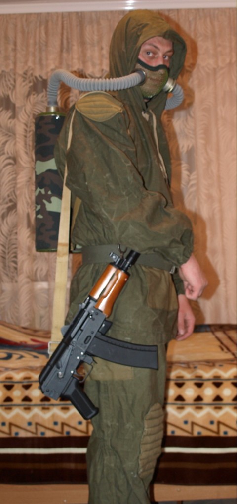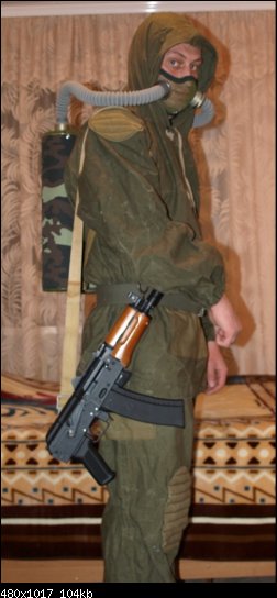 Комок пошит из плащ палаток уже обкатан на иге просто сутер. По затратам вышел в районе 500грн. но шился с учетом дальнейшего использования на играх. Балоны из канализ труб и фильтров + трубки от противогазов. Затраты в районе 100грн. Маска из нержи держит шары нехило как для меня удобно сидят.